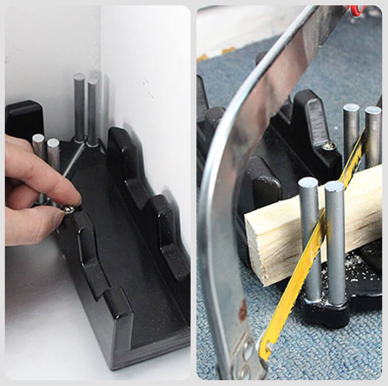 2 fleksible armer måler vinkler fra 90° til 180° og kan brukes direkte til å måle alle vinkler innenfor dette området. Når du har funnet vinkelen, plasserer du det nakne brettet på verktøyets base innenfor den medfølgende føringen, og sager det deretter med baksagen for å få presise og feilfrie gjæringssnitt.