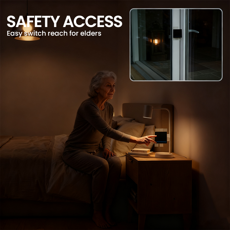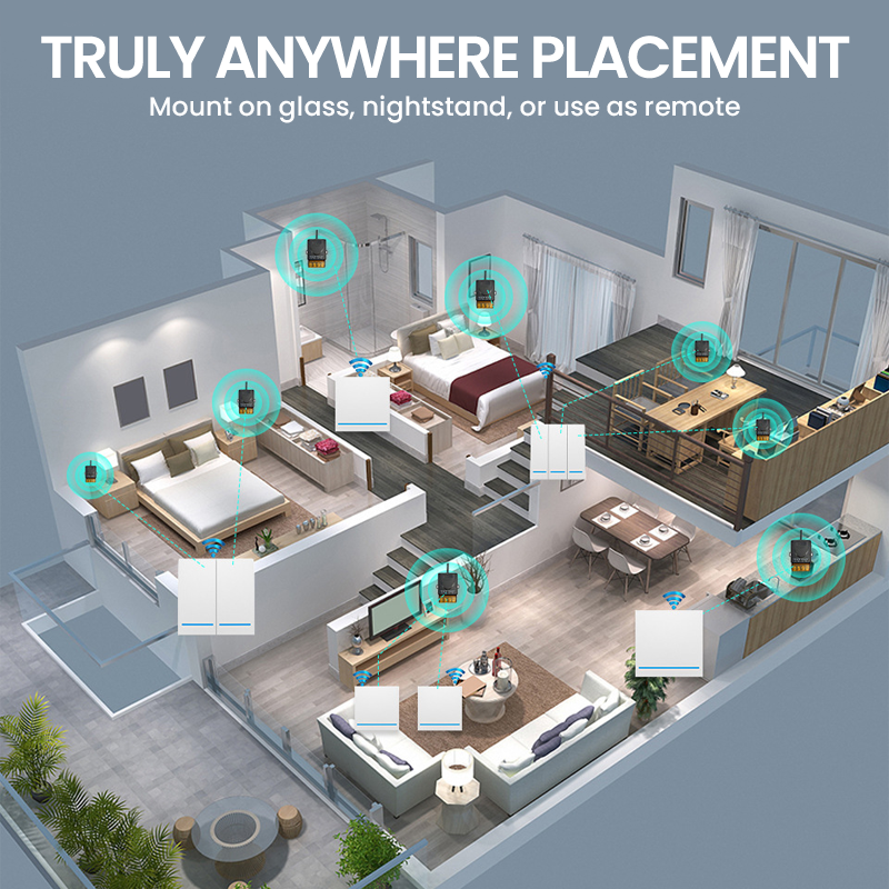 ULTIMAT PLASSERINGSFLEKSIBILITET – Slipp unna faste bryterplasseringer. Monter panelet på glass, plasser det på nattbordet eller bruk det som en bærbar fjernkontroll, noe som gir deg enestående bekvemmelighet og tilgjengelighet.