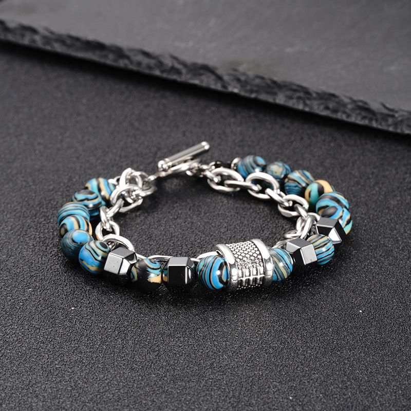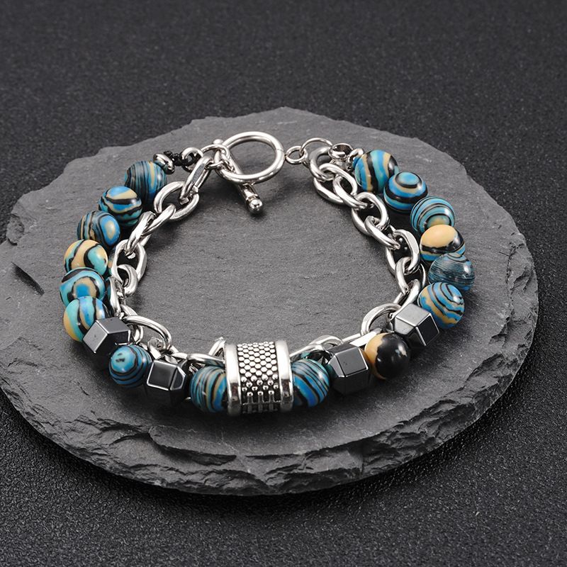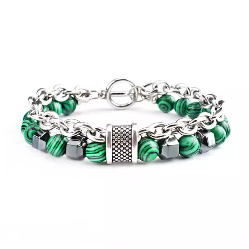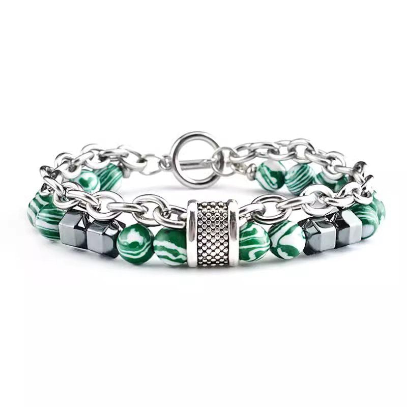UNIKE PERLEMØNSTRE: Armbåndets unike perlemønstre viser frem de naturlige variasjonene og skjønnheten til malakittsteinene.