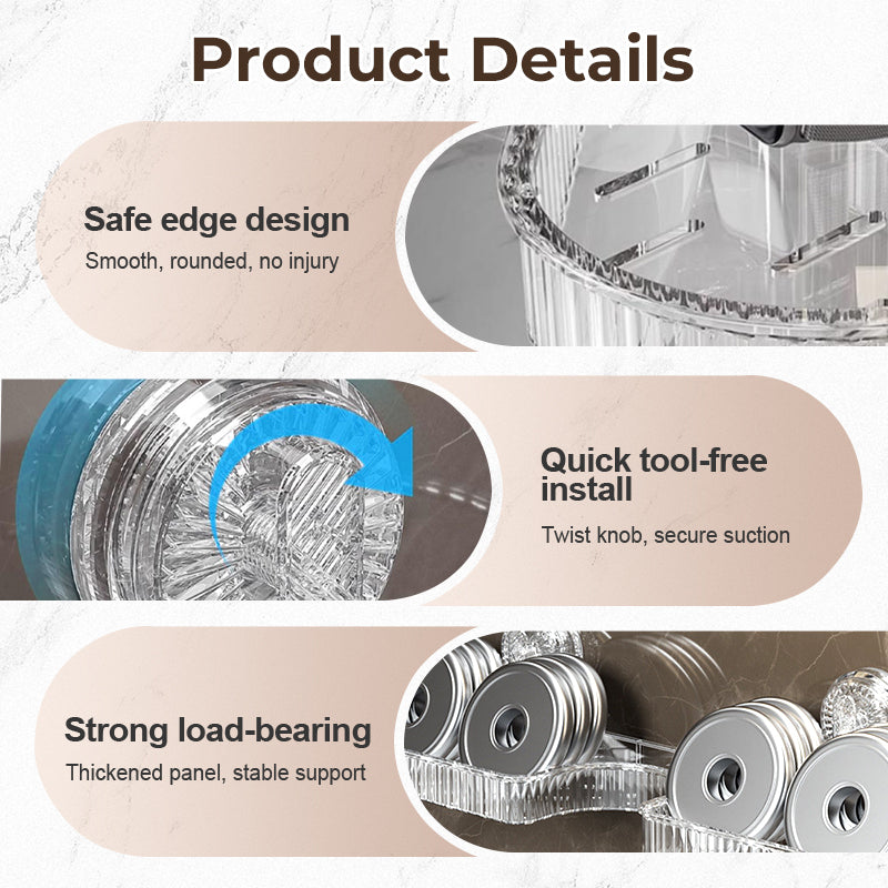 ENKEL VERKTØYFRI INSTALLASJON: Bare vri og stram knappen for å feste sugekoppen godt. Vakuumadhesjonsdesignet sikrer sterk stabilitet uten å skade vegger eller overflater. Flere finpolerte kanter gjør håndteringen sikker, og unngår riper eller håndskader.