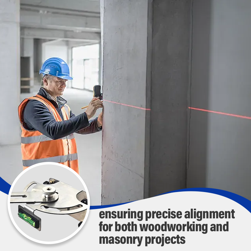 180 GRADERS FRI ROTATION FÖR PRECIS JUSTERING:Verktyget har en smidig 180-graders vridmekanism med en justerbar knopp, vilket möjliggör snabba vinkeljusteringar för olika uppgifter. Denna design eliminerar behovet av flera verktyg, vilket sparar tid och samtidigt säkerställer precis inriktning för både trä- och murbruksprojekt.